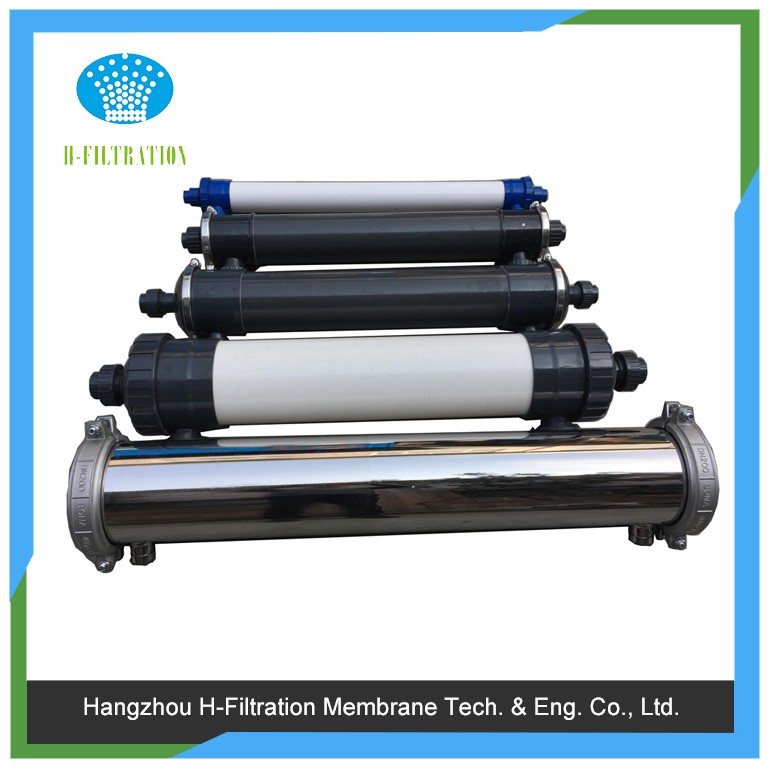 本品為外壓式超濾膜組件,根據(jù)膜組件外壁的箭頭方向,箭頭指向的端口是超濾透過液出口,下端是原液進(jìn)口,側(cè)面兩個端口是排濃(回流)口;